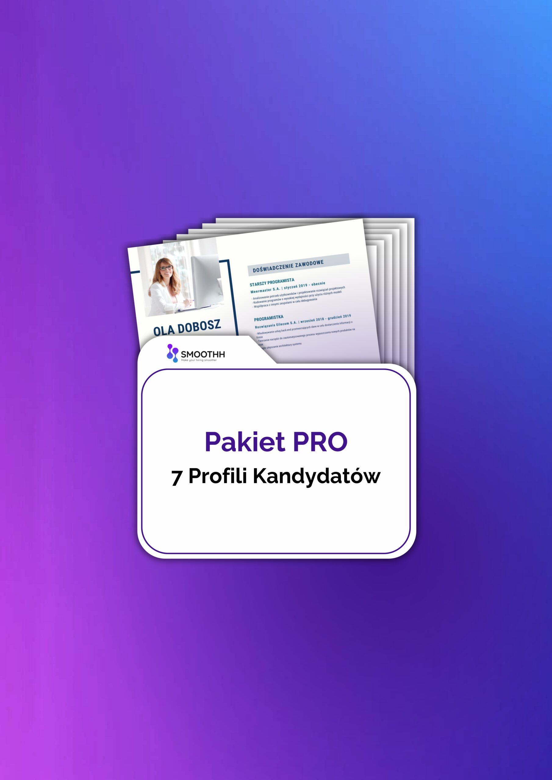 Profil Kandydata SMOOTHH® składa się z aktualnego CV oraz osobnego pliku zawierającego wszystkie kluczowe informacje odnoszące się do wymagań, które określiłeś w formularzu zamówienia (oczekiwania finansowe, dostępność, kompetencje twarde i miękkie). Plik jest sporządzany przez headhuntera, który prowadził rozmowę rekrutacyjną z kandydatem.